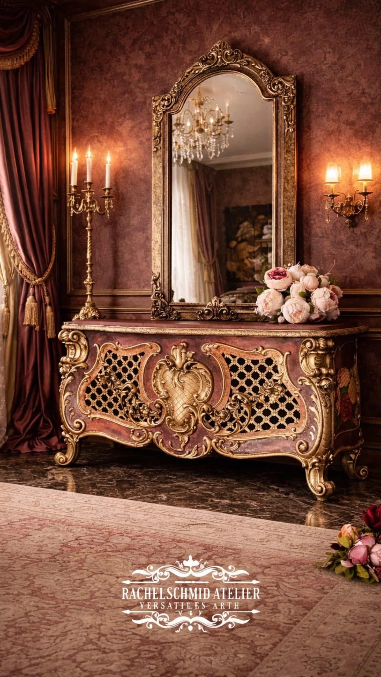 Antique furniture is carefully restored and artistically reimagined, always with respect for its past and a deep emotional sensibility. Soft tones, delicate patina, gilded details, and ornate forms reflect an aesthetic inspired by Versailles and shaped by a distinctive artistic hand.