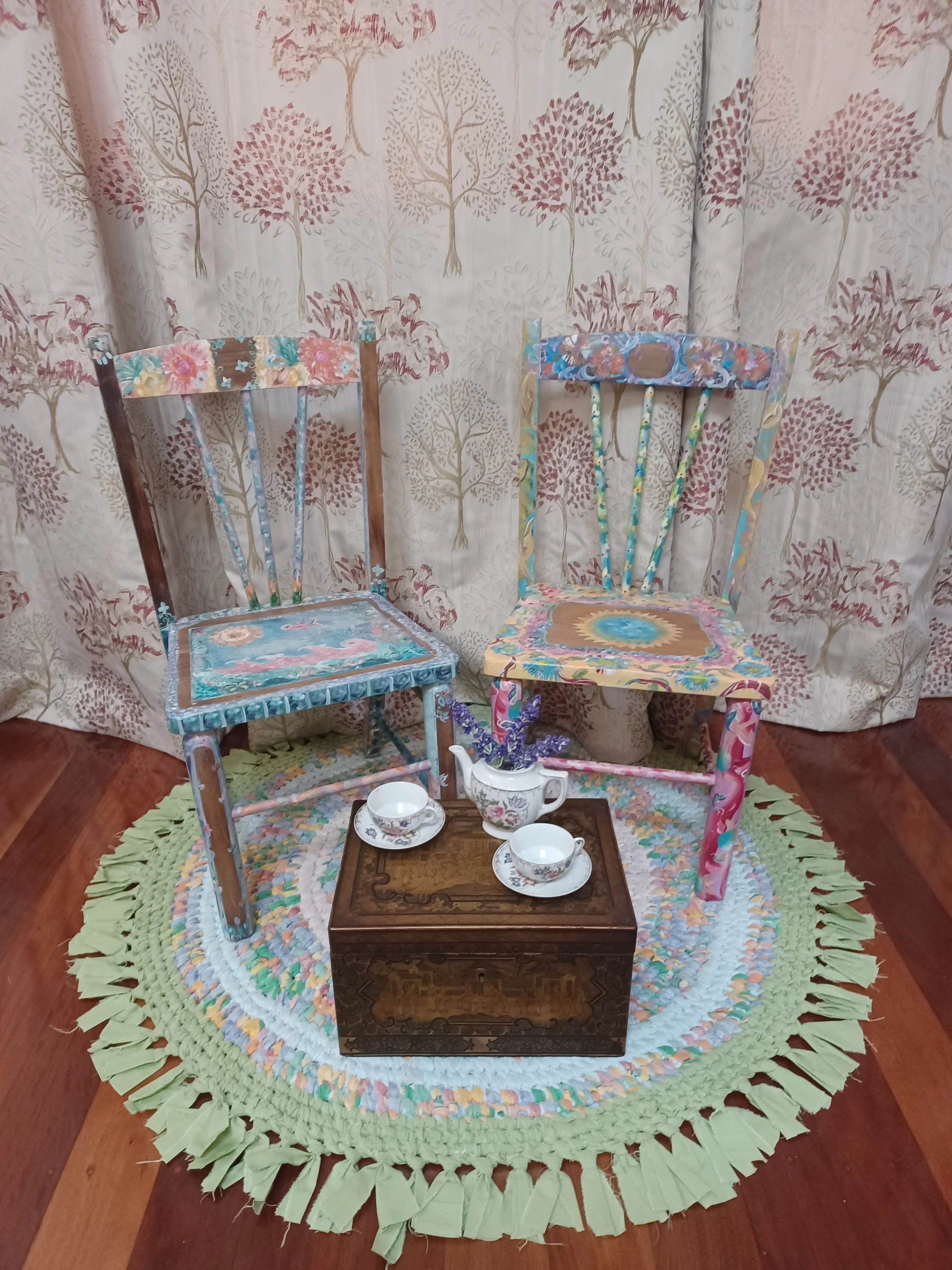 My painted furniture journey began with a discarded kitchen chair, no wall space for art and a need for a visual journal. By sourcing furniture from op-shops and curbsides I am honouring the life of the tree that provided the timber, was felled, milled, shaped, and eventually cast aside. I use acrylic paint and occasionally chalk paint if stencilling.